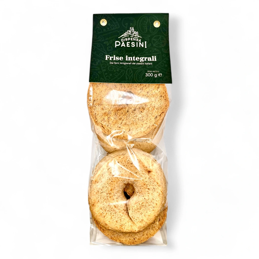 Frise Integrali 300g - Un prodotto da forno artigianale di alta qualità realizzato con farina integrale di grano tenero, sale, acqua, lievito naturale di frumento e lievito di birra.