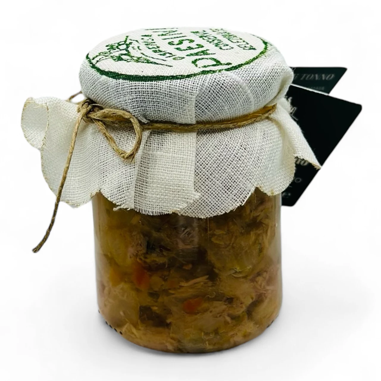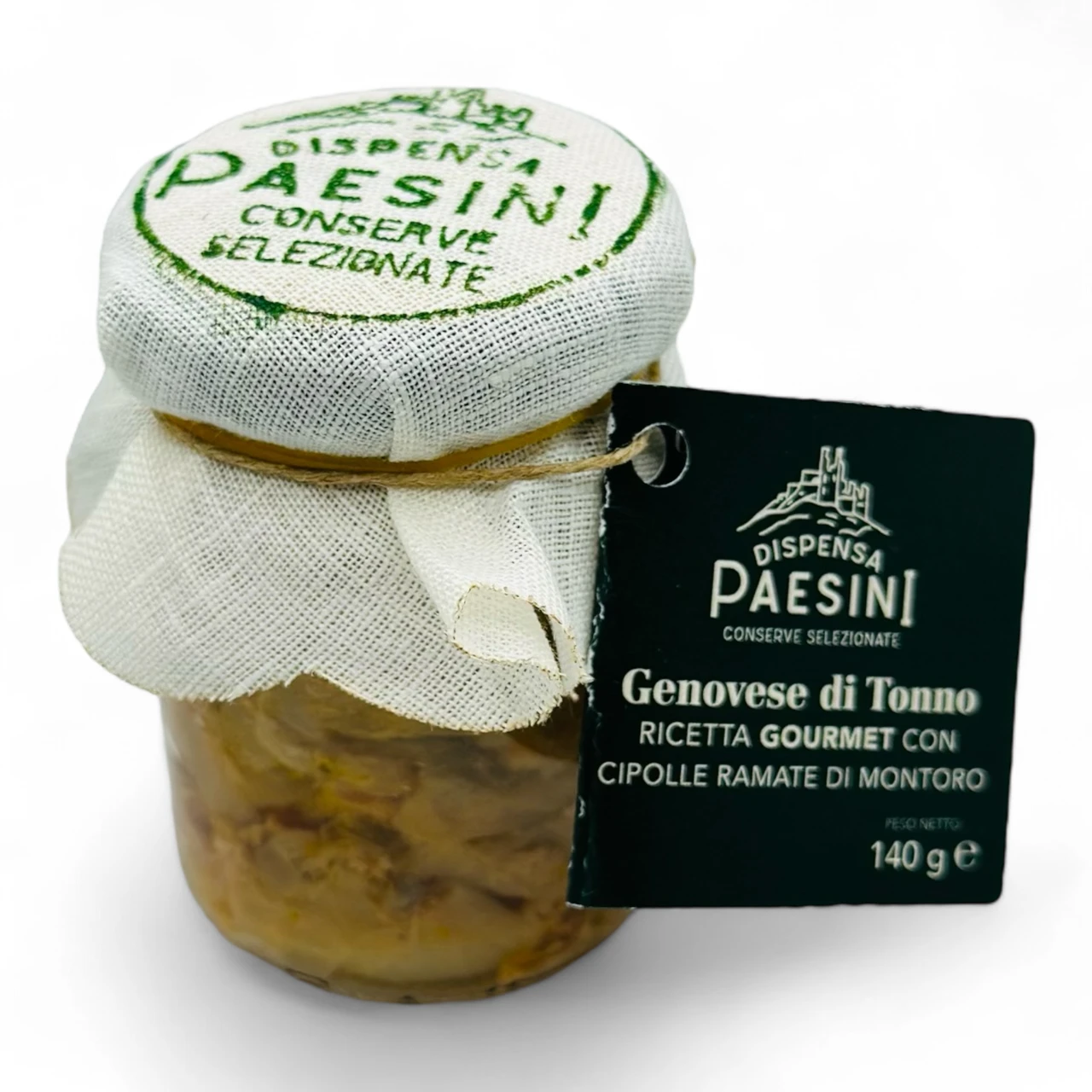 Il sugo alla Genovese di Tonno di Dispensa Paesini è un condimento artigianale unico, realizzato con Cipolla Ramata di Montoro e Tonno di altissima qualità.