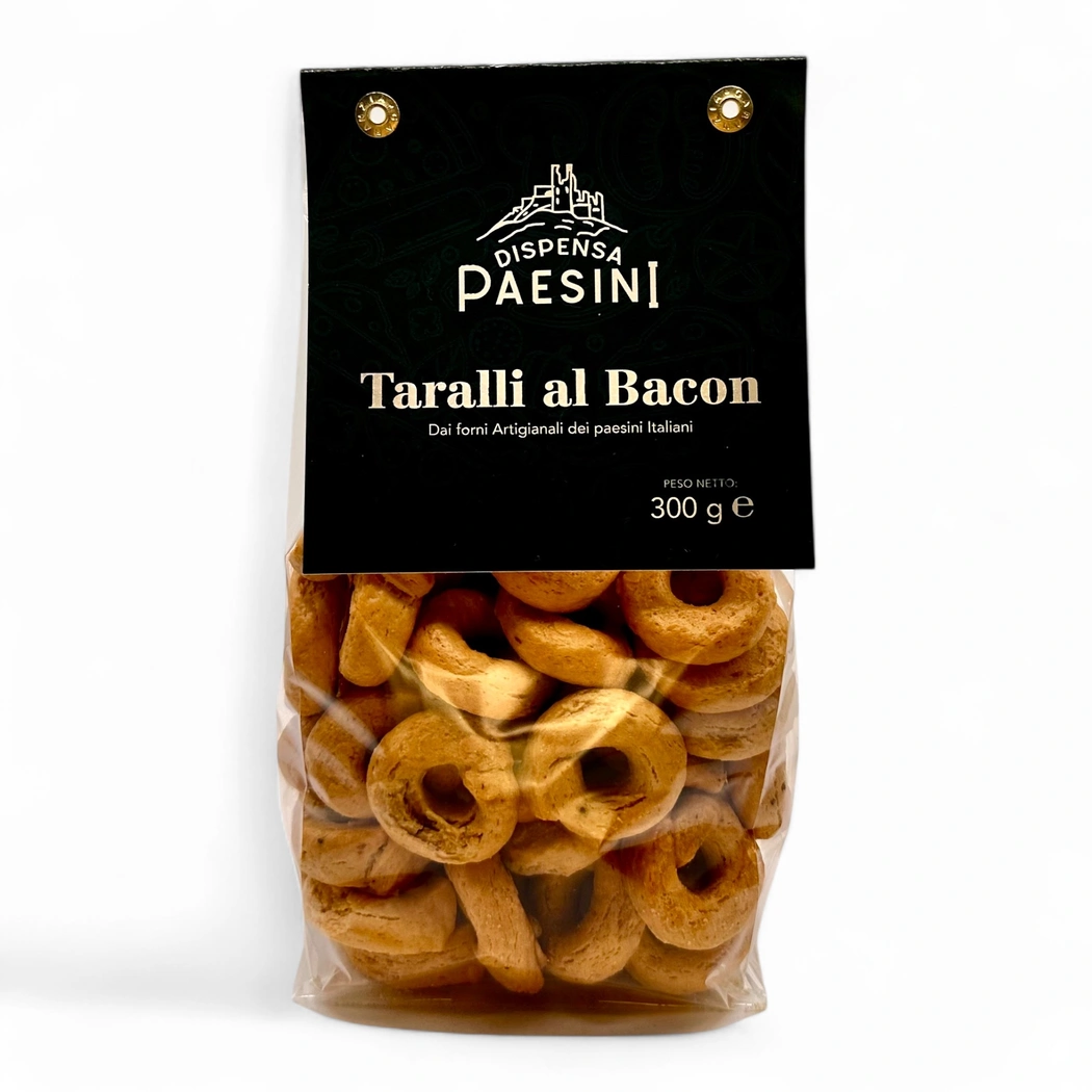 I Taralli al Bacon di Dispensa Paesini sono una deliziosa variante dei classici taralli pugliesi, arricchiti con un aroma intenso di bacon.