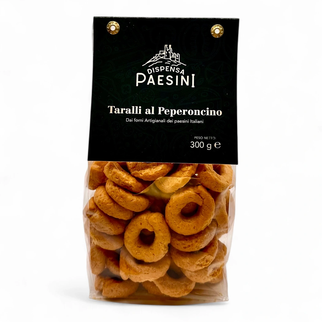 Scopri i Taralli al Peperoncino: croccanti e dal gusto intenso. Perfetti per un aperitivo speziato e artigianale.