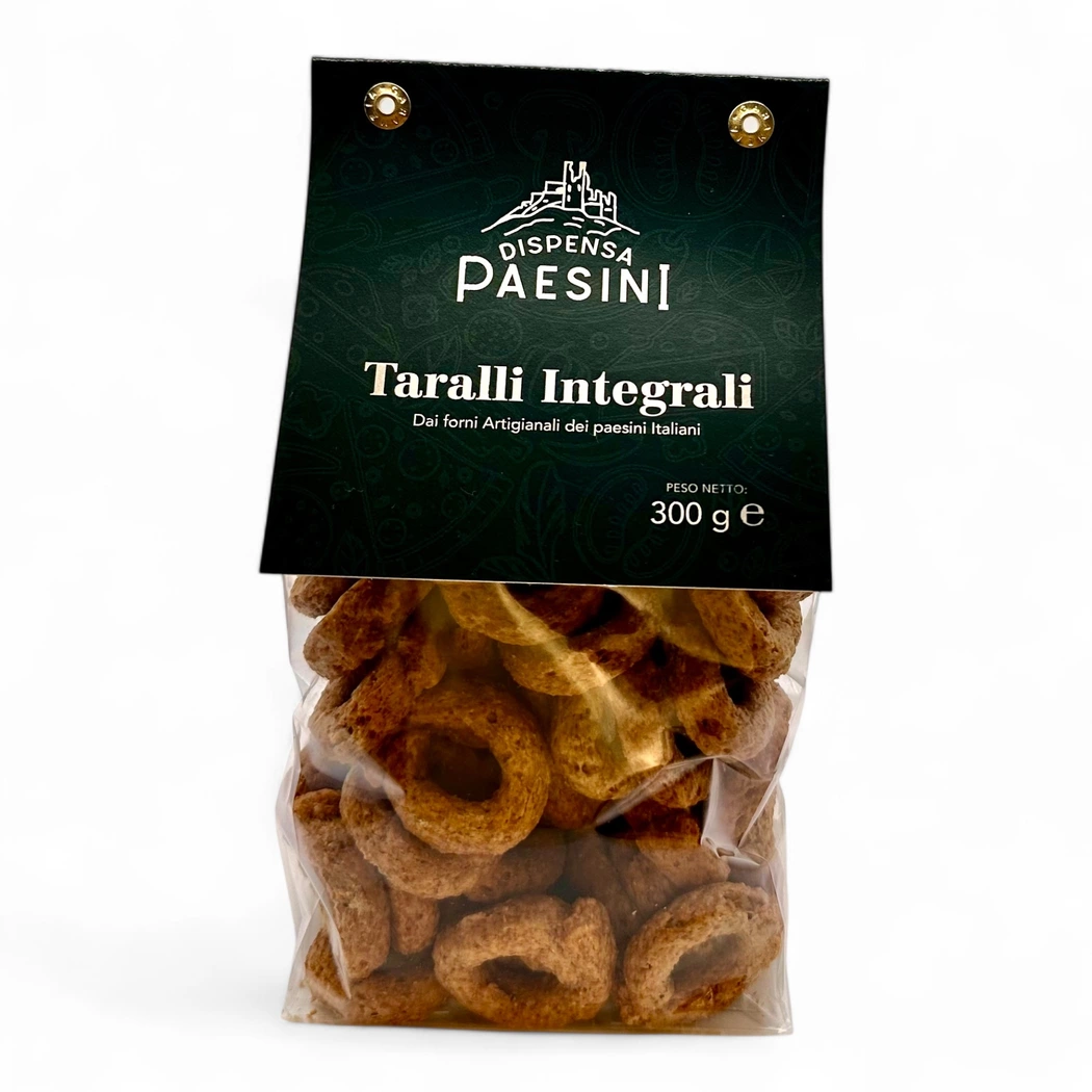 Scopri i Taralli Integrali artigianali di Dispensa Paesini: gusto unico e ingredienti naturali, senza coloranti né conservanti.