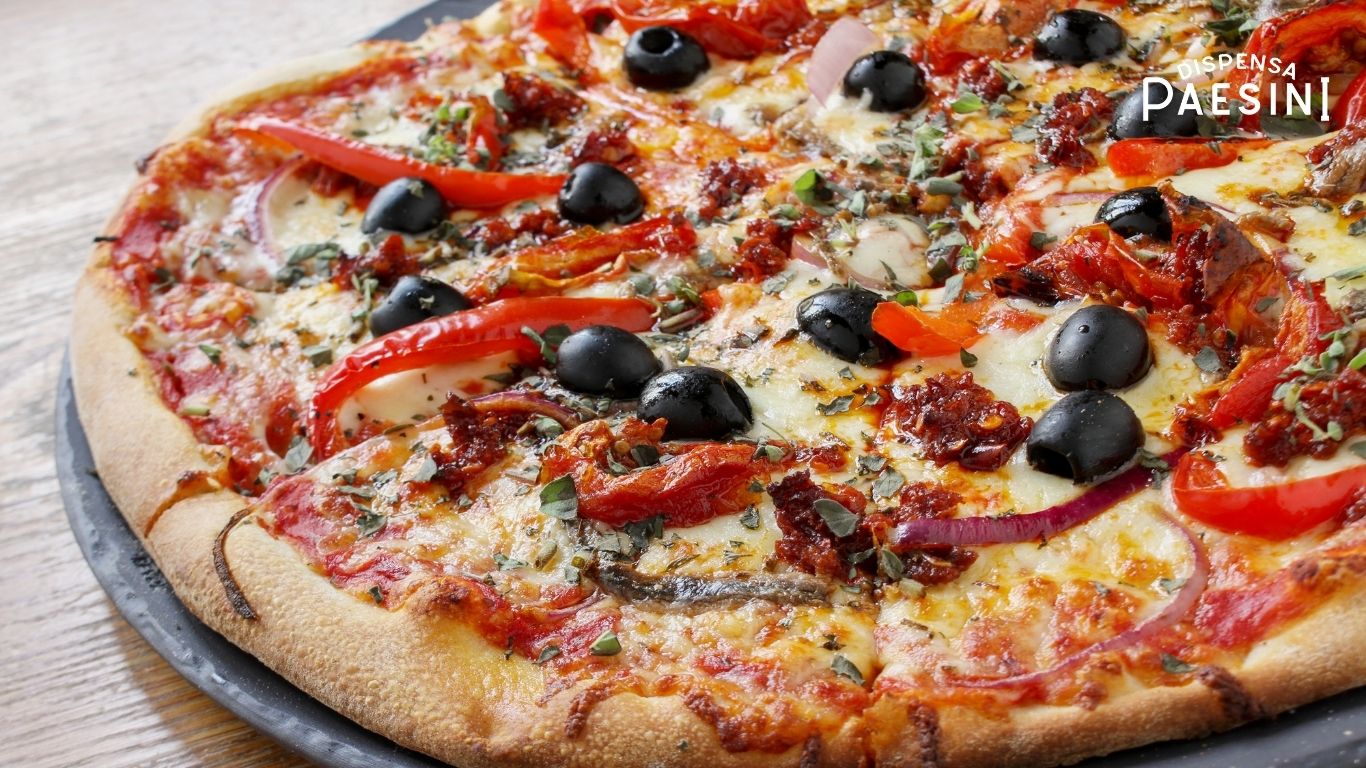 Perfetta con cipolla rossa, mozzarella, olive e un filo d’olio a crudo.